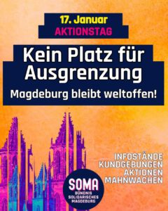 Am 18. Januar lädt das Bündnis Solidarische Magdeburg zu einem vielfältigen Aktionstag ein, der zeigt: Magdeburg und Sachsen-Anhalt stehen zusammen gegen Hass und Hetze!
